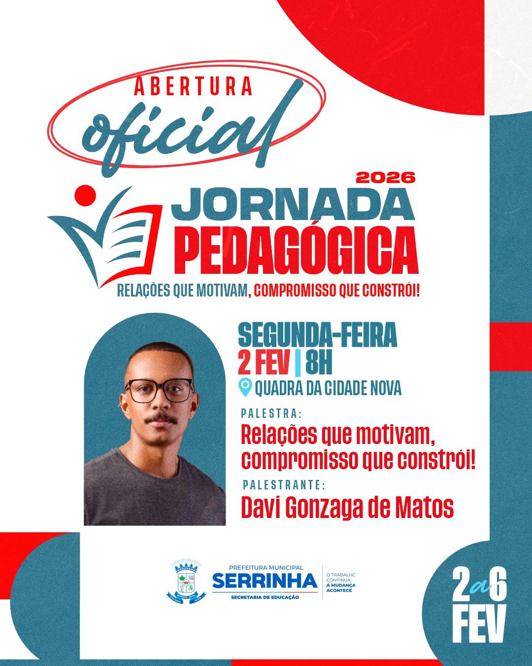 A Abertura Oficial da Jornada Pedagógica 2026 já tem data marcada e será um importante momento de encontro, reflexão e alinhamento para o início de mais um ano letivo na rede municipal de ensino.