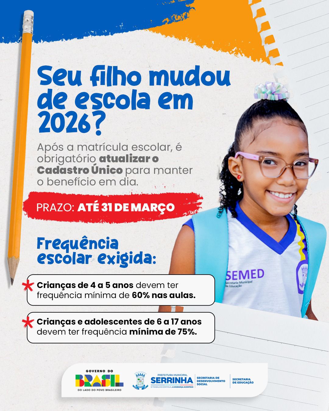 Famílias inscritas no Cadastro Único (CadÚnico) devem ficar atentas: se houve mudança de escola em 2026, é obrigatório atualizar as informações até o dia 31 de março, garantindo a continuidade dos benefícios sociais.