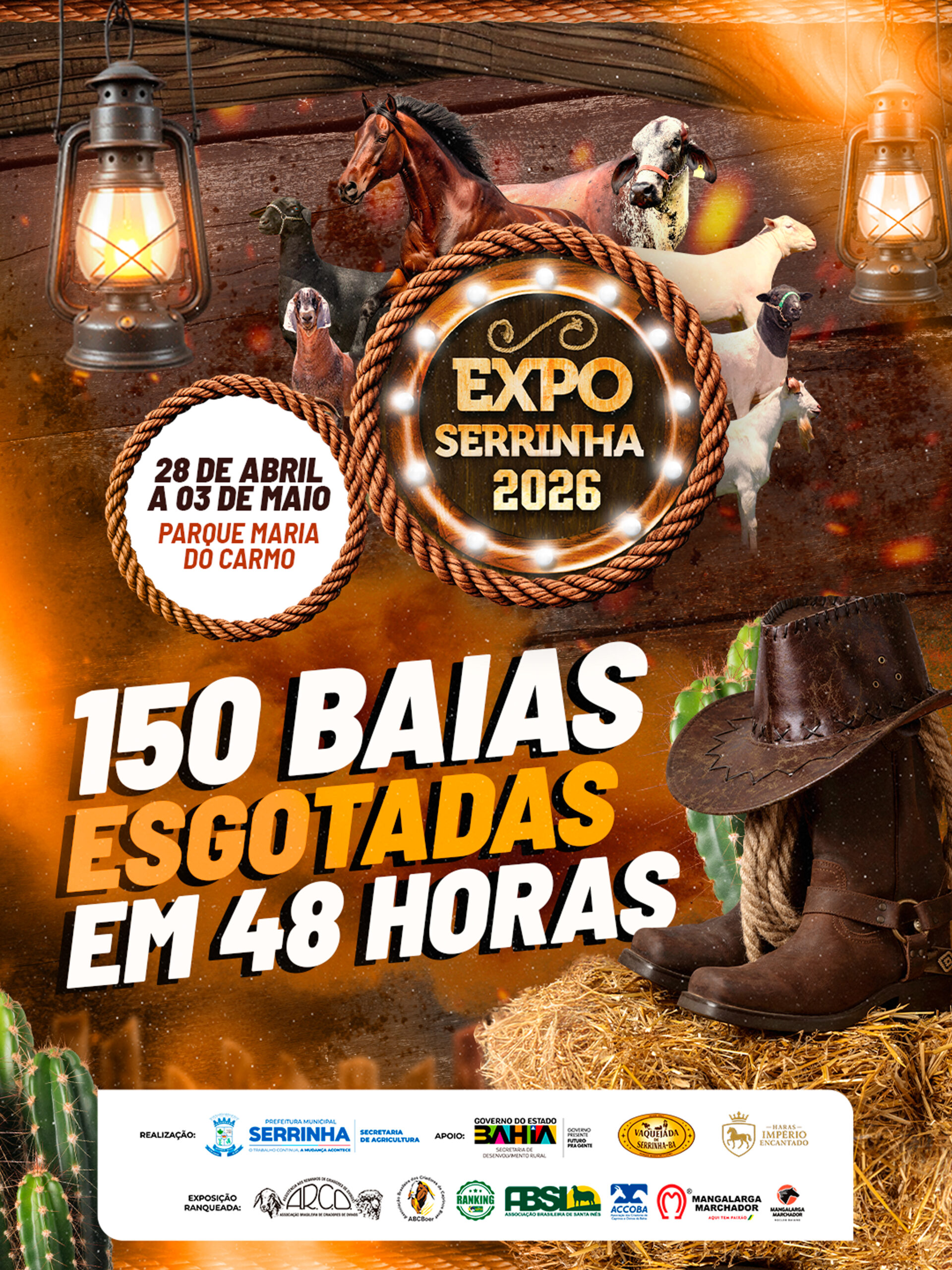 A Expo Serrinha 2026 já começou fazendo história. Em apenas dois dias, todas as 150 baias disponíveis foram totalmente esgotadas, um resultado que reforça a força, a credibilidade e o crescimento contínuo do evento.