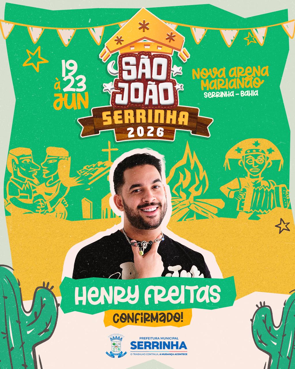 O clima de festa já começou em Serrinha. Sucesso em toda a região e dono de diversos hits que ganharam destaque em todo o país, Henry Freitas está confirmado como uma das atrações do São João de Serrinha 2026.