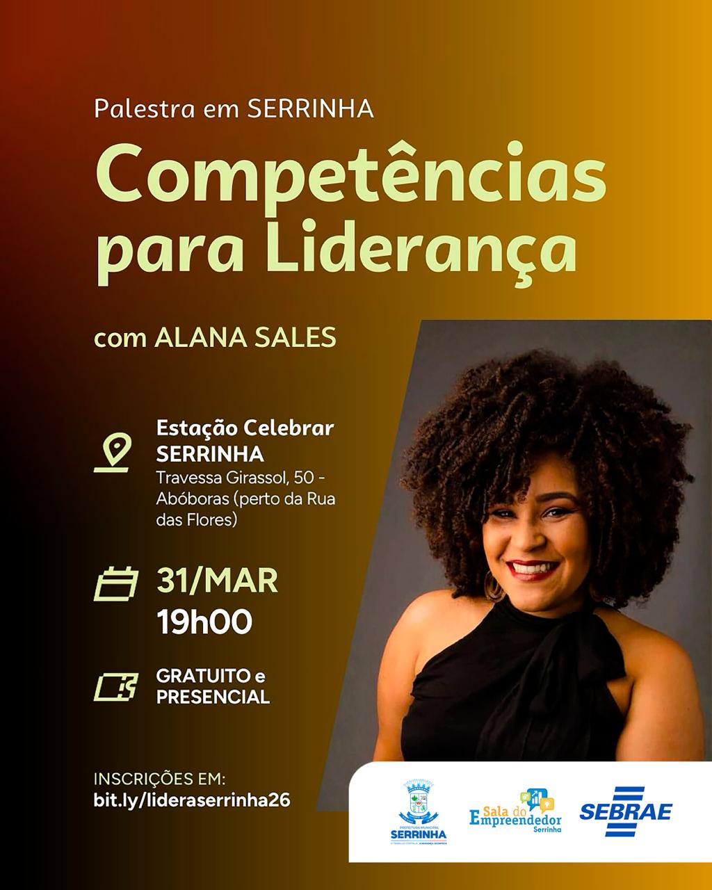 Serrinha vai receber, no dia 31 de março, a palestra “Competências para Liderança”, com Alana Sales, trazendo um momento de aprendizado voltado para quem deseja se desenvolver e se destacar no mercado de trabalho.