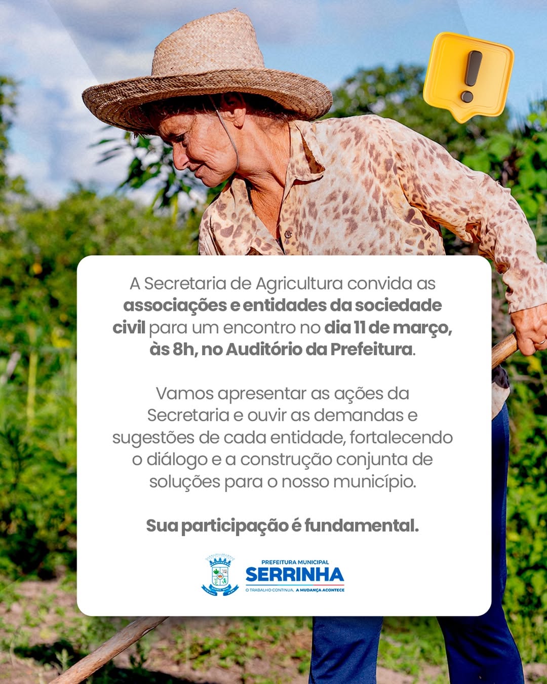 A Secretaria de Agricultura de Serrinha convida as associações e entidades da sociedade civil para um encontro que será realizado no dia 11 de março, às 08h, no Auditório da Prefeitura de Serrinha.