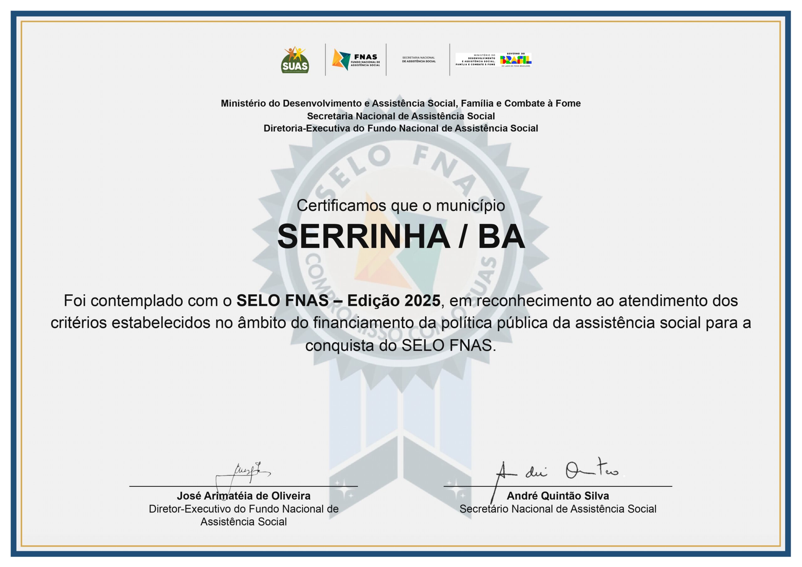 Serrinha conquistou o Selo FNAS 2025, uma certificação federal que reconhece estados e municípios pela gestão transparente, eficiente e de qualidade dos recursos da Assistência Social.